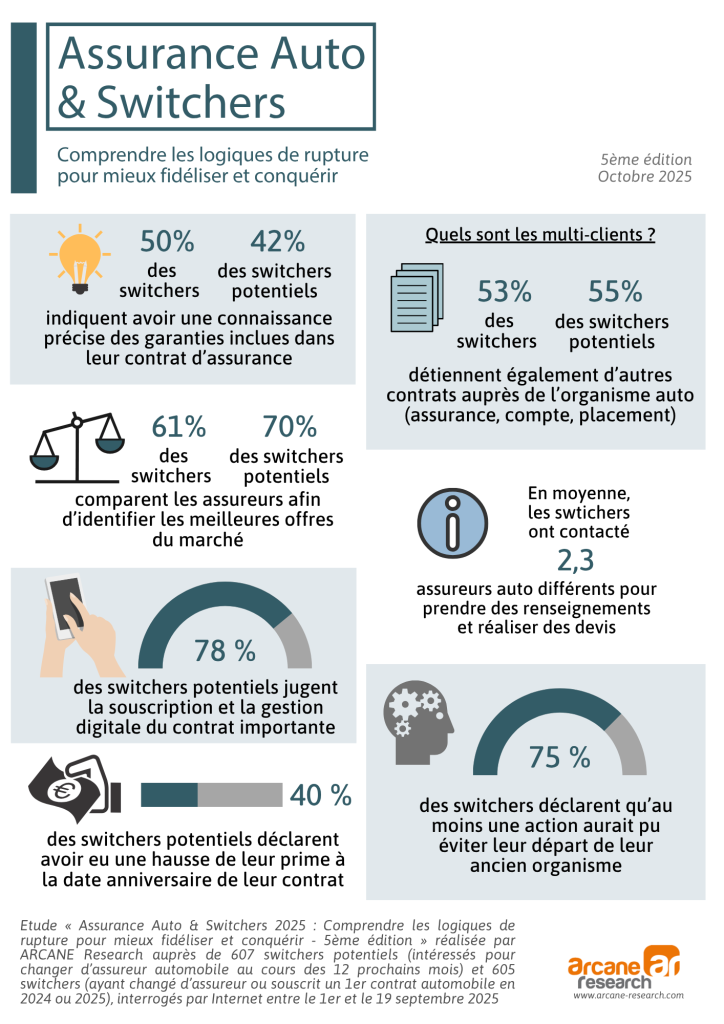 3/4 des switchers déclarent qu’au moins une action aurait pu éviter leur départ de leur ancien organisme. Pour en savoir plus, cliquez sur l’infographie ci-dessous ou sur Etude Assurance automobile (le Switch) parue en octobre 2025.