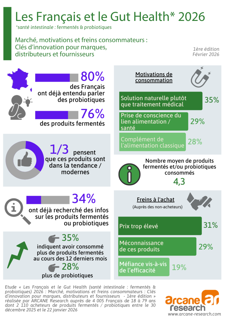 Un tiers des Français a déjà recherché des informations sur les produits fermentés ou probiotiques. Pour en savoir plus, cliquez sur Etude Gut Health 2026 ou consultez l’infographie ci-dessous :