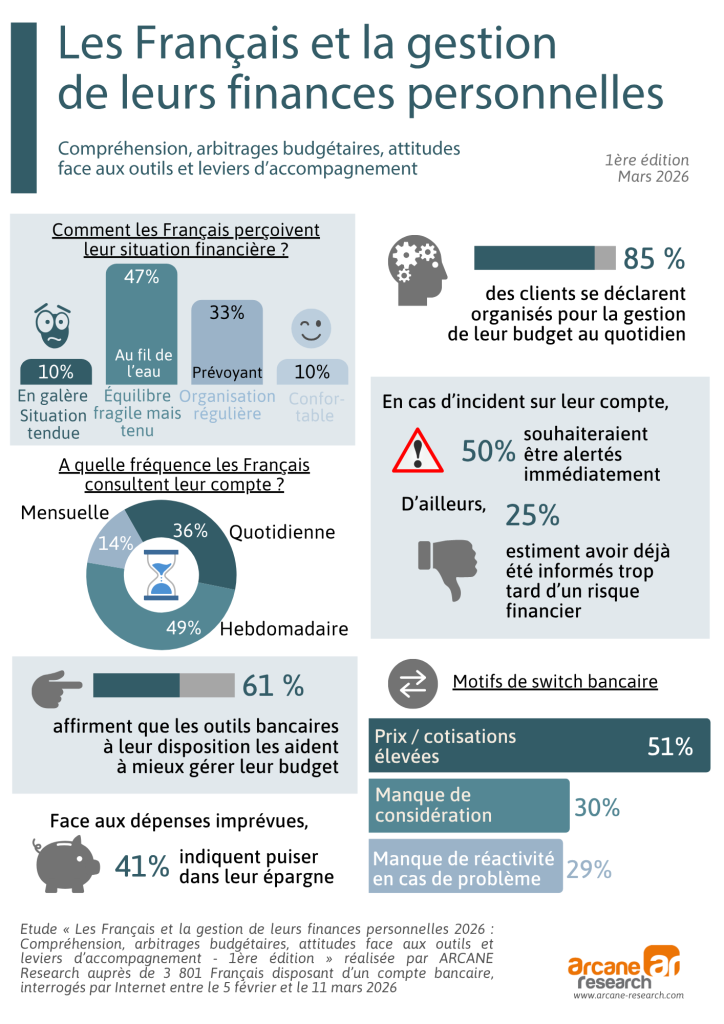 Près de la moitié des Français perçoivent leur situation financière comme un équilibre fragile mais tenu. Pour en savoir plus, cliquez sur Etude Les Français et la gestion de leurs finances personnelles 2026 ou consultez l’infographie ci-dessous :